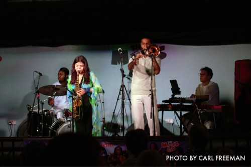 Some deft cymbal and snare developed into another inspired drum solo from Cassius, settling into a 12/8 Flamenco-inspired rhythm, accentuated with syncopated claps from Allexa and Jai as Cody added a simple synth bass groove leading us into “No Time”, Allexa’s second single release. This featured Allexa using various effects to expand the soundscape of her alto sax in another blistering solo and another fluttering excursion on the keys from Cody to the backdrop of cymbal splashes and clacking rimshots from Cassius. Jai then piped up with his response in the form of another illustrious trombone solo before the band regrouped to play out the head with spectacular excitement!