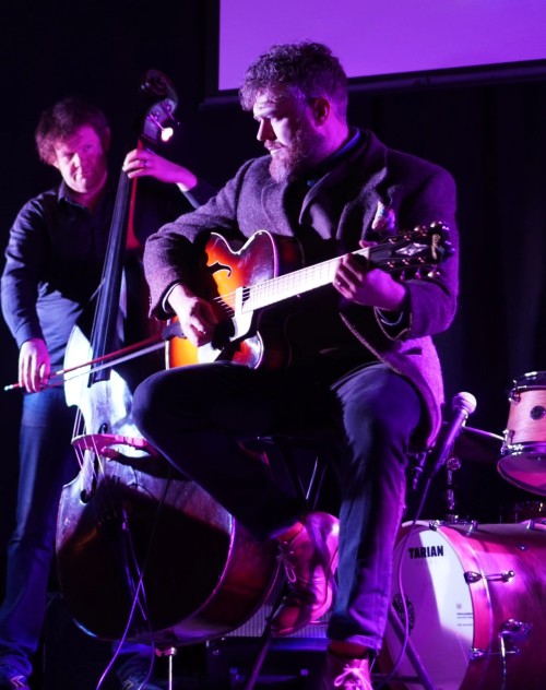 The quartet returned to “Source of the Severn” for “Machia Wallia”, the title translating from the Latin as “Welsh Marches”. A tune about the questions of identity that arise as the result of living in a border area this composition is jointly credited to the whole quartet and was initially developed out of a series of collective improvisations. The change of personnel with Thorne coming into the band in place of Phillips has resulted in a change of group dynamics. With no disrespect to the very competent Phillips Thorne is a more adventurous player, more obviously rooted in improvisation and experimentation. He’s also highly adept with the bow and this new version of the group features a greater degree of arco playing. Tonight “Machia Wallia” was introduced by an extended passage of unaccompanied bowed bass with Thorne’s deep and haunting sonorities eventually joined in duet by Barnes’ guitar. The pair also work as a duo and just before Christmas 2025 I enjoyed a seasonally themed duo performance from them at the Left Bank in Hereford. The addition of piano and drums saw Batten establishing a groove that formed the basis for solos from Barnes and Gonsalez, the latter’s subtly probing piano excursions incorporating a wilful dissonance that further muddied the waters. Thorne, now playing pizzicato, was featured on double bass, his solo presaging a more powerful riff based section. This tune about “an identity crisis” finally resolved itself by coming full circle with an atmospheric coda featuring just guitar and arco bass.